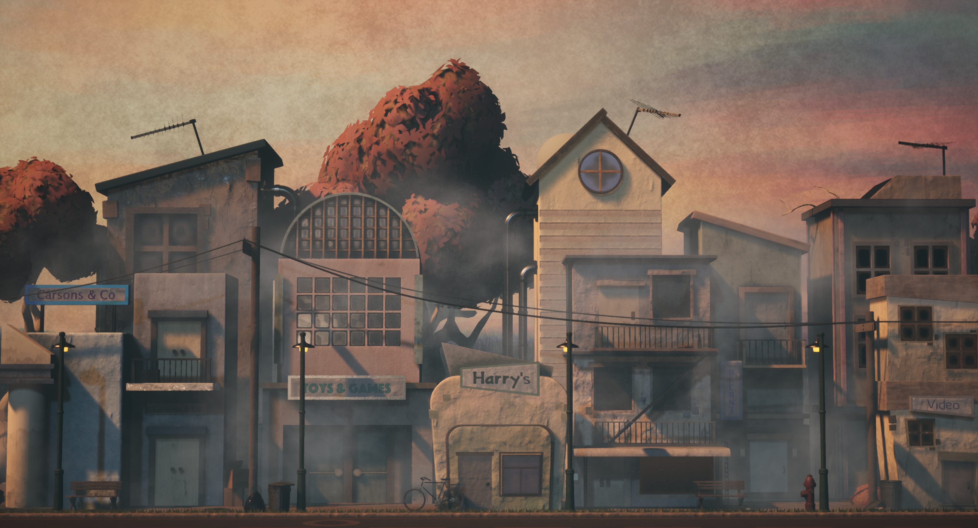 The buildings were inspired from 90's + Post-Modern architecture research.